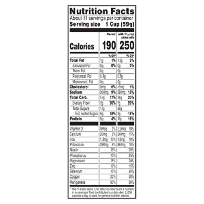 Calories in Raisin Bran and Nutrition Facts - FatSecret Raisin Bran Nutrition Facts Serving Size 1 cup Amount Per Serving Calories 180 % Daily Values* Total Fat 1.56g 2% Saturated Fat 0.301g 2% Trans Fat - Polyunsaturated Fat 0.743g Monounsaturated Fat 0.385g Cholesterol 0mg 0% Sodium 303mg 13% Total Carbohydrate 42.74g 16% Dietary Fiber 6.5g 23% Sugars 17.3g Protein 4.87g Vitamin D - Calcium 100mg 8% Kellogg's Raisin Bran® Original cereal - SmartLabel™ Kellogg's Raisin Bran® Kellogg's Raisin Bran® Original cereal. 76.5 oz. 00038000779008. Nutrition . Ingredients . Allergens . Features & Benefits . Company, Brand & Sustainability . 190. Calories. 0 g. Sat Fat. 200 mg. Sodium. 17 g. Sugar. Nutrition Facts. Servings Per Container About 36. Serving Size 1 Cup (59 g) Amount Per Serving Cereal ... Raisin Bran 1 cup Nutrition Facts & Calories - Self NUTRITION INFORMATION Amounts per Custom Food (56g) Footnotes for Raisin Bran 1 cup Source: Nutrient data for this listing was provided by Custom. Each " ~ " indicates a missing or incomplete... Is Raisin Bran Healthy? Nutrition, Benefits, and Downsides Raisin bran tends to be fairly calorie-dense and high in fiber, protein, and added micronutrients. The nutrient composition of a 1-cup (55-61-gram) serving of raisin bran made by three popular...