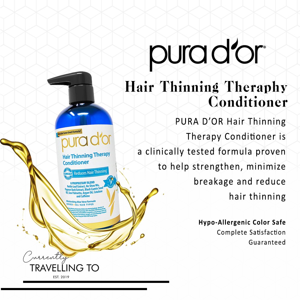 pura d'or Advanced Therapy Anti-Hair Thinning Shampoo & Conditioner Duo ... pura d'or advanced therapy anti-hair thinning shampoo & conditioner duo bottle color may vary(1) 24.0 fl oz shampoo & (1) 24.0 fl oz conditionerhelps reduce hair thinning, breakage, hair fall, dullness, dryness & frizzhelps increase volume, strength, thickness, moisture, shine & luster17 key active ingredients: argan oil, biotin, he shou wu, …