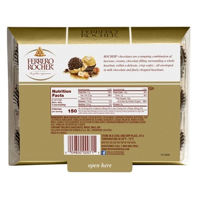 Calories in Ferrero Rocher - Free Calorie Chart UK There are 75 calories in 1 piece of Ferrero Rocher. There are 151 calories in 2 pieces of Ferrero Rocher. There are 226 calories in 3 pieces of Ferrero Rocher. There are 302 calories in 4 pieces of Ferrero Rocher. There are 377 calories in 5 pieces of Ferrero Rocher. There are 603 calories in 100g of Ferrero Rocher. Percentage of calories from ... Fer Grand Rocher Easter - 4.4 OZ - Online Groceries | Shaw's Call 1-800-688-3552. Hollow Chocolate Ornament: Made in Poland. Ferrero Rocher Chocolates: Made in Italy. Show More Show Less. Ingredients. Nutrition Facts; Serving Size: Servings Per Container: Calories: Amount Per Serving (-) Information is currently not available for this nutrient % Daily Value: Ferrero Rocher Grand - 4.4 OZ - Online Groceries | Safeway Hollow milk chocolate and hazelnut ornament. Happy Holidays! . Facebook. Like us on Facebook at FerreroRocherUSA. Instagram. Follow us on Instagram at FerreroRocherUSA. For nutrition information call 1-800-688-3552. Made in Poland. Nutrition Facts.