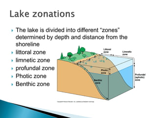 Lake | Classification of Lakes (types of lakes) - PMF IAS A lake is a body of water of considerable size, localized in a basin, that is surrounded by land apart from a river or other outlet that serves to feed or drain the lake. Lakes lie on land and are not part of the ocean, and therefore are distinct from lagoons, and are also larger and deeper than ponds. Natural lakes are generally found in ... LAKES AND OCEANS: THEIR LIFE ZONES - Follow Green Living Three different life zones have been identified based on the abiotic environmental variables and they are named as: Littoral zone Pelagic zone Benthic zone The littoral zone is the shallow region of a water body, where water meets land. It has the greatest diversity in the lake. A high diversity of plants is present in this zone.
