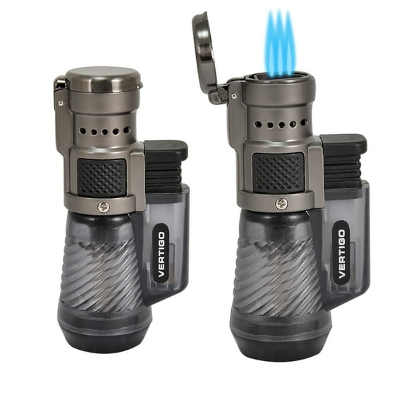 Duet Cigar Cutter by Vertigo - Lotus Lighters Duet Cigar Cutter by Vertigo $ 5.00 Stainless steel guillotine cutter Two Cigar cutters in one! Integrated v-cut cigar cutter Fits up to 56-ring gauge cigar Sold in a 24-pk to retail stores & sold individually to customers Cutters come packaged in self-liquidating on-counter displays. Available in: Black