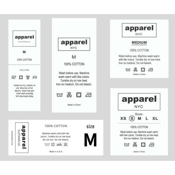 100% Cotton Wash Care Labels - Fabric Care Tags (Qty. 100) Text on Labels: 100% Cotton, Machine wash cold, Tumble dry low, No bleach, Cool iron only ; This listing is for a set of 100 wash care labels. These clothing labels are made non-fray nylon and printed with permanent ink. LABEL SIZE: 1" x 1.25" COLOR OF MATERIAL: White COLOR OF TEXT: Black FONT: Calibri