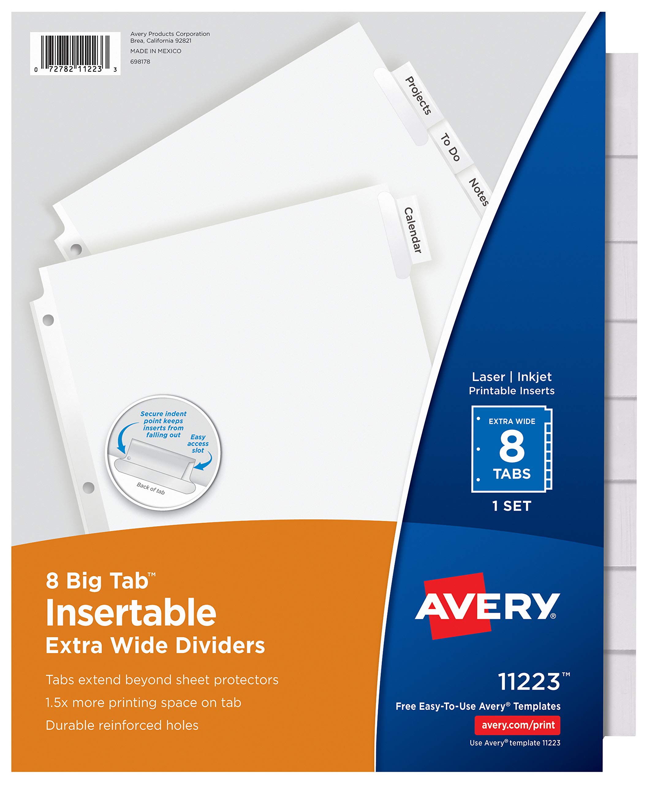 Avery 11201 Insertable Style Edge Tab Plastic Dividers, 8-Tab, … Avery Dividers for 3 Ring Binders, 8-Tab Binder Dividers, Plastic Binder Dividers, Insertable Big Tabs, Multicolor, 3 Sets (71901) 4.7 out of 5 stars 2,369 7 offers from $6.00 Avery Products Template Compatibility | Avery.com Preview Production Description Same As; Big Tab Index Maker Easy Apply Dividers, 5-Tab: 11490, 11492: Big Tab Index Maker Easy Apply Dividers, 8-Tab: 11491, 11493