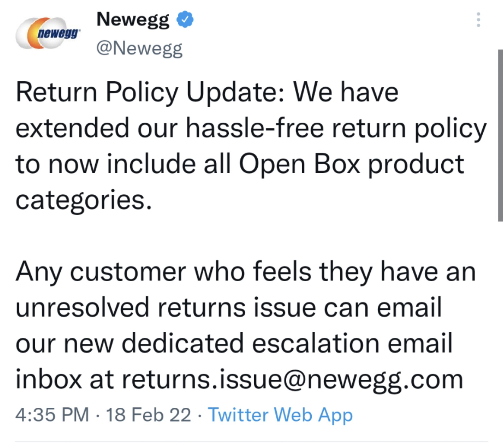 Newegg Broadens Open-Box Return Policy Amid Backlash Newegg's tweet indicates, as per our headline, that retailer has broadened its hassle-free returns pledge to all open-box product categories. Moreover, it shares a new dedicated escalation email ...