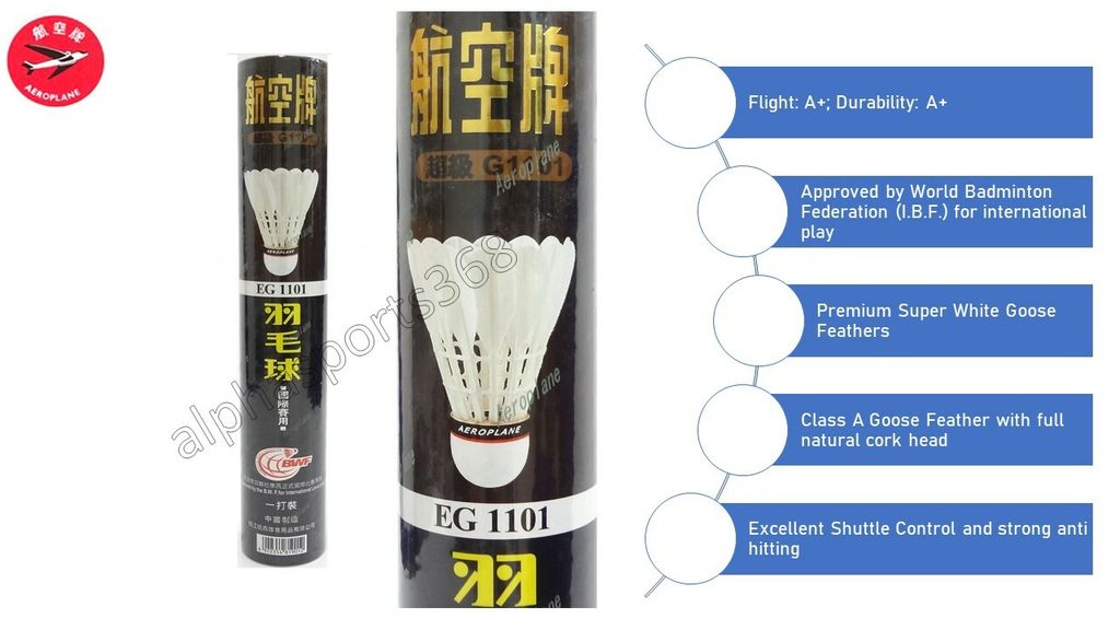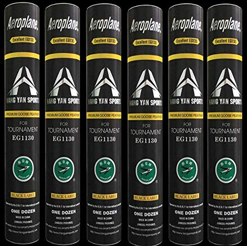 Aeroplane Shuttlecock EG1130 (Black Label) - Excellent Grade Aeroplane Shuttlecock EG1130 (Black Label) - Excellent Grade Brand: Aeroplane 25 ratings | 6 answered questions $4199 Flight:A+; Durability:A+ Approved by the International Badminton Federation (I.B.F.) for international play Premium Super White Goose Feathers Foil Lining For Thermal Protection And Easy Removal Excellent Shuttle Control