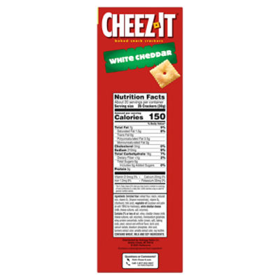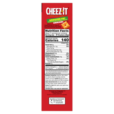 Cheez-It® Original Snack Crackers - SmartLabel™ - Kellogg's 150 Calories 1.5 g Sat Fat 230 mg Sodium 0 g Sugar Nutrition Facts Servings Per Container About 7 Serving Size 27 Crackers (30 g) *The % Daily Value (DV) tells you how much a nutrient in a serving of food contributes to a daily diet. 2,000 calories a day is used for general nutrition advice. Information last updated on 04-05-2022 by Kellogg's Cheez-It® Original | Cheez-It® Nutrition Ingredients Enriched flour (wheat flour, niacin, reduced iron, vitamin B1 [thiamin mononitrate], vitamin B2 [riboflavin], folic acid), vegetable oil (high oleic soybean, soybean, palm, and/or canola oil with TBHQ for freshness), cheese made with skim milk (skim milk, whey protein, salt, cheese cultures, enzymes, annatto extract color).