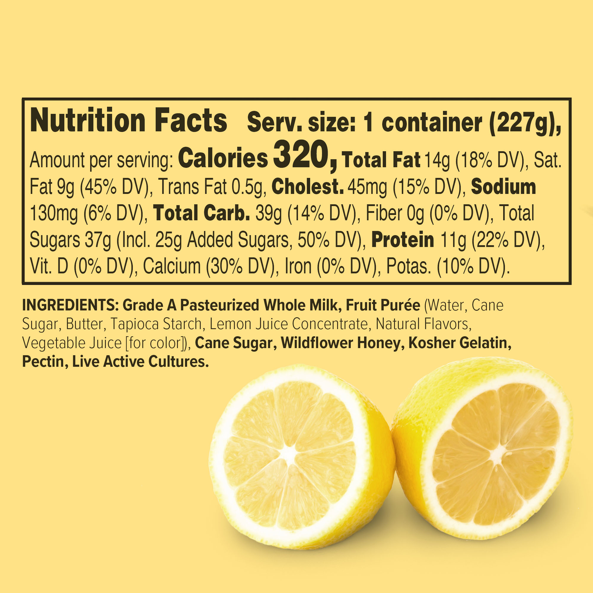 lemon yogurt | noosa nutrition facts 8oz 320 calories 14g fat 11g protein 37g sugar Amount Per Serving % Daily Values* Calories 320 Fat Cal. 126 Total Fat 14g 18% Saturated Fat 9g 45% Trans Fat 0.5g Cholesterol 45mg 130% Sodium 130mg 6% *Percent daily values based to a 2000 calorie diet. Total Carb 39g 14% Fiber 0g 0% Sugars 37g Includes 25g Added Sugars 50%