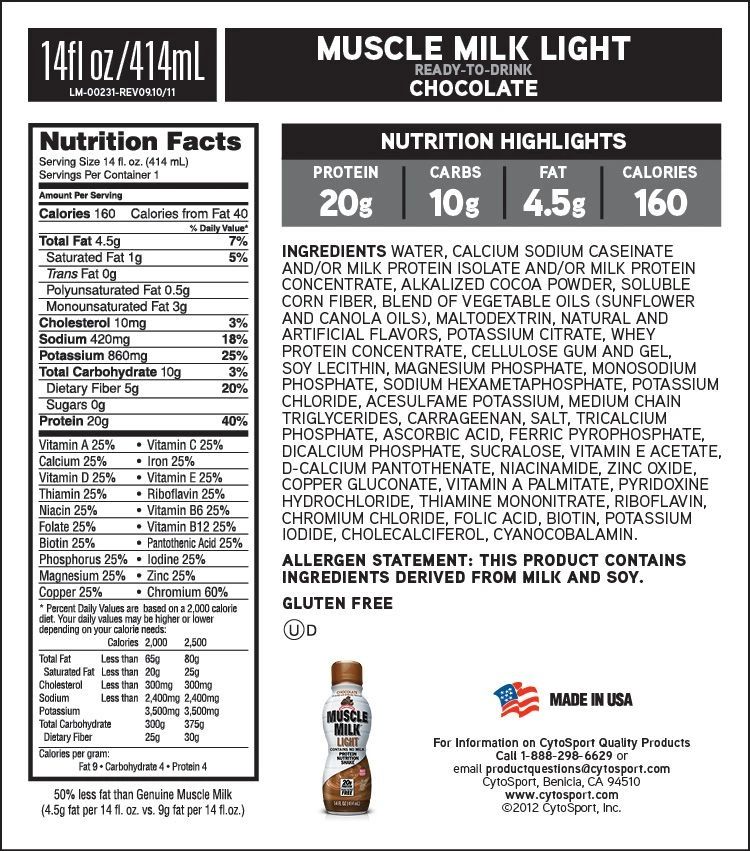 Beverages, CYTOSPORT, Muscle Milk light, Ready-To-Drink - ReciPal Nutrition facts label and information for Beverages, CYTOSPORT, Muscle Milk light, Ready-To-Drink - Per 100 grams: 34.0 calories, 1.03g fat, ... CytoSport Muscle Milk Light Chocolate Protein Nutrition Shake - H-E-B CytoSport Muscle Milk Light Chocolate Protein Nutrition Shake ; Total Carbohydrate, 5g, 2% ; Dietary Fiber, 1g, 4% ; Sugars, 0g ; Protein, 15g, 30% ...